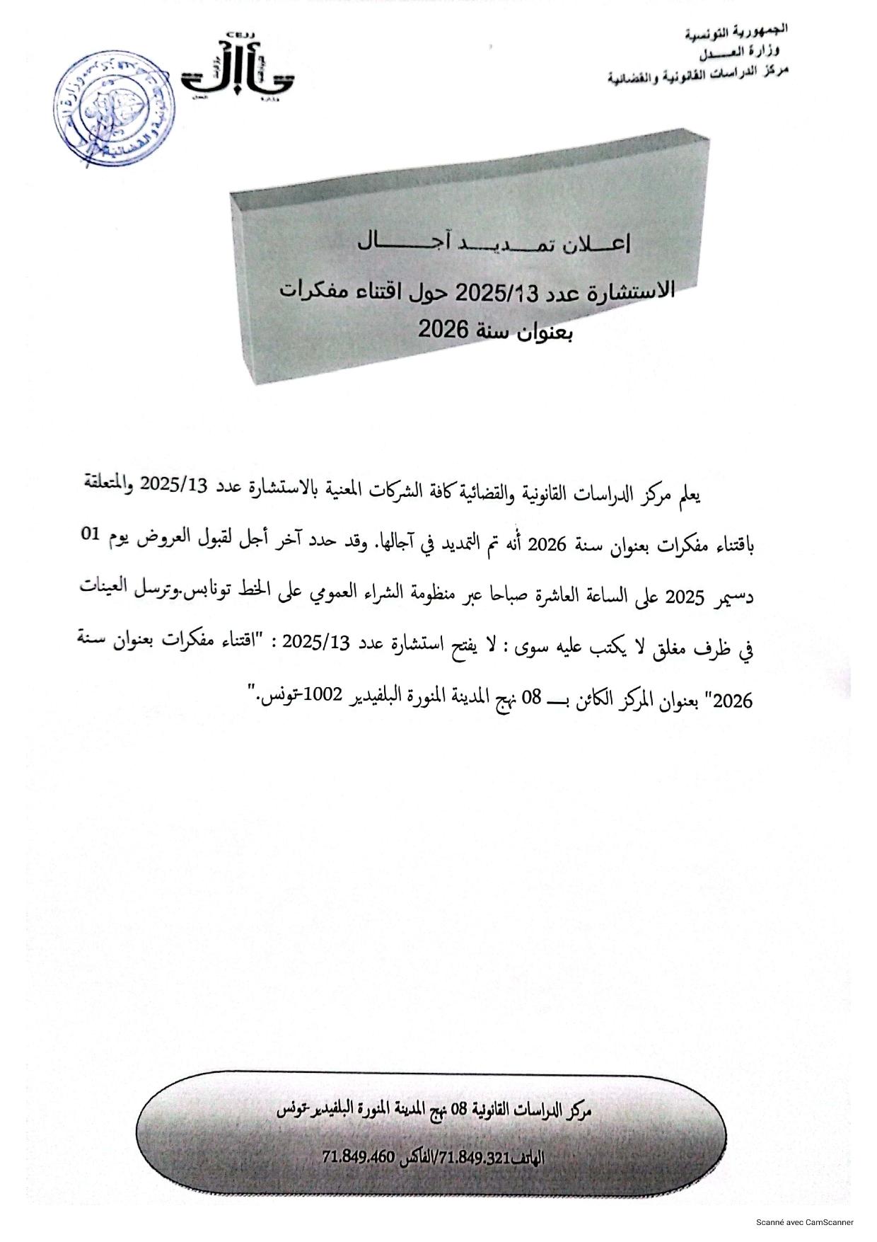 تمديد في اجال استشارة عدد 13/2025 حول اقتناء مفكرات بعنوان سنة 2026